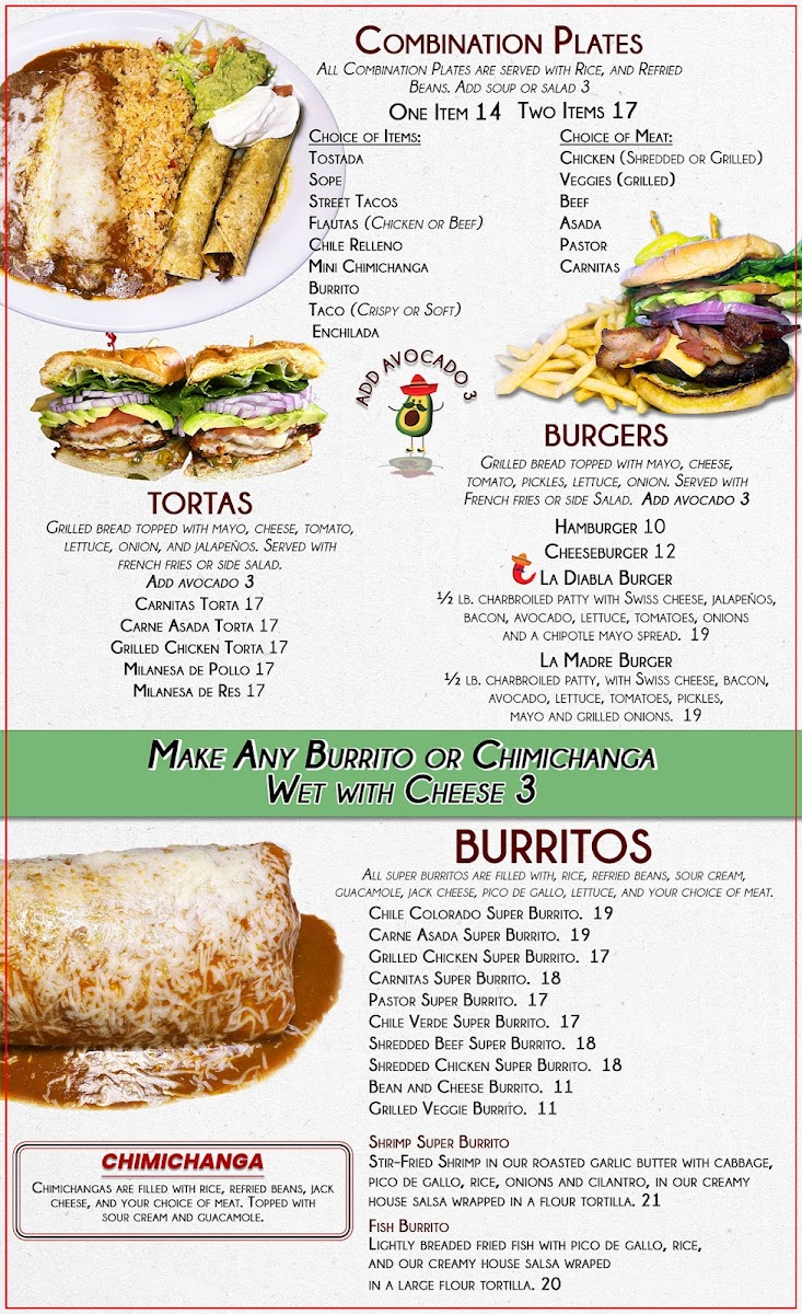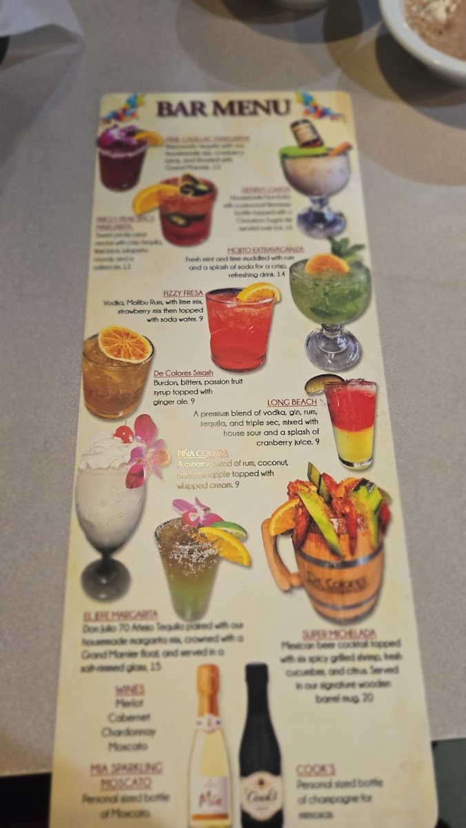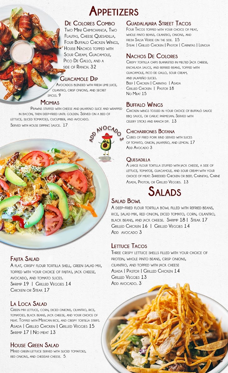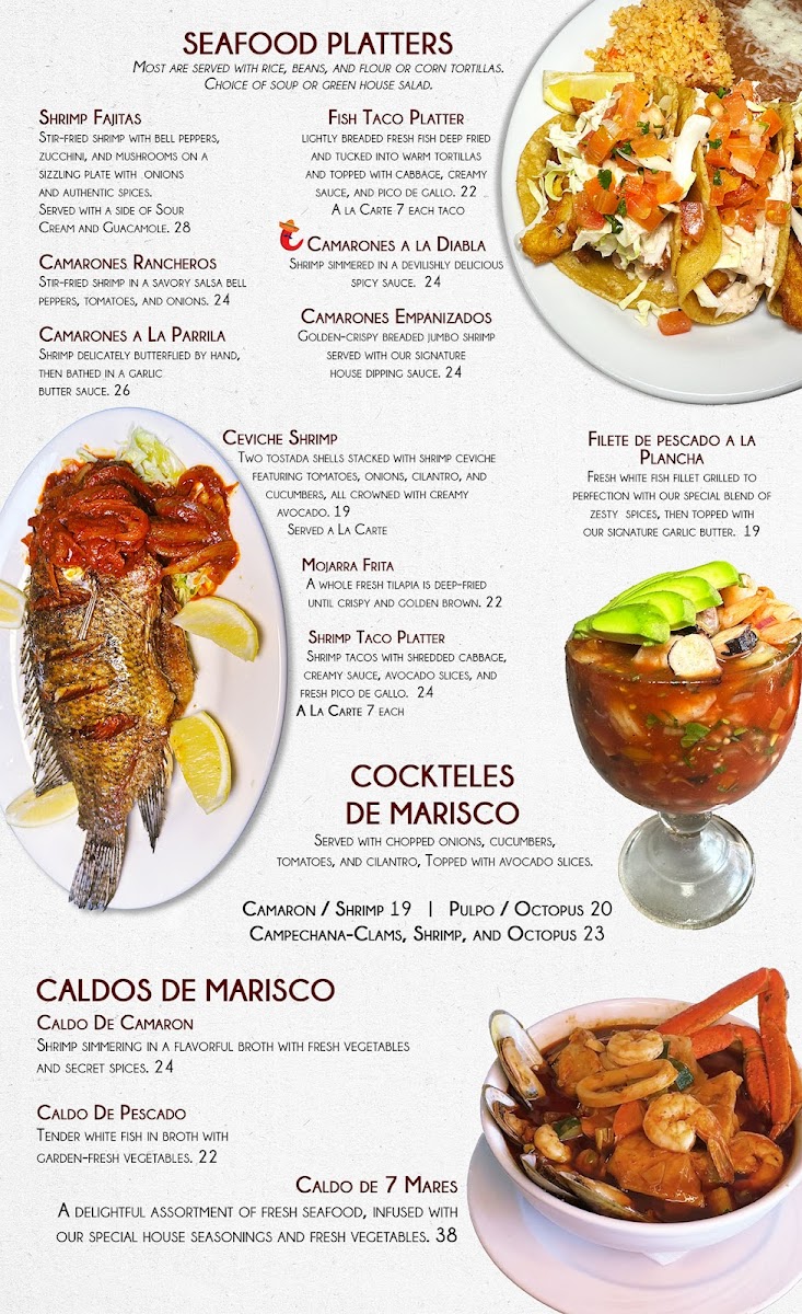 De Colores Mexican Restaurant & Bar offers an extensive and vibrant menu that caters to a variety of tastes. For those craving pork, the Carnitas Tacos Platter and Chuletas Ahumadas stand out, while the Chicharrones En Salsa and Chile Verde provide a savory twist. Seafood lovers can indulge in the Camarones A La Parrila or Ceviche Shrimp, and those seeking more heat can try the Camarones A La Diabla or Shrimp Fajitas. For a filling meal, the burritos like the Shredded Chicken Super Burrito and Lengua Super Burrito are packed with flavor. Tortas and burgers include the bold La Diabla Burger and the juicy Carnitas Torta. If you're in the mood for something lighter, the Botana Marisquera and Aguachile "Don Gil" offer refreshing seafood options. Beef platters such as the Carne Asada and Steak Fajitas highlight rich, grilled meats, while the De Colores House Special brings unique flavors to the table. For a comforting start, try the Nachos De Colores or Guacamole Dip as appetizers. The Mexican-style breakfast selections like Machaca Con Huevos and Huevos Con Chorizo are perfect for early risers, and the desserts like Arlene's Homemade Tres Leches Cake and Churros offer a sweet end to your meal. With refreshing drinks like Mandarin Jarritos and Mexican Coke, alongside hearty caldos such as Menudo and Caldo De Pollo, De Colores caters to every craving, making it a must-visit spot for authentic Mexican cuisine.